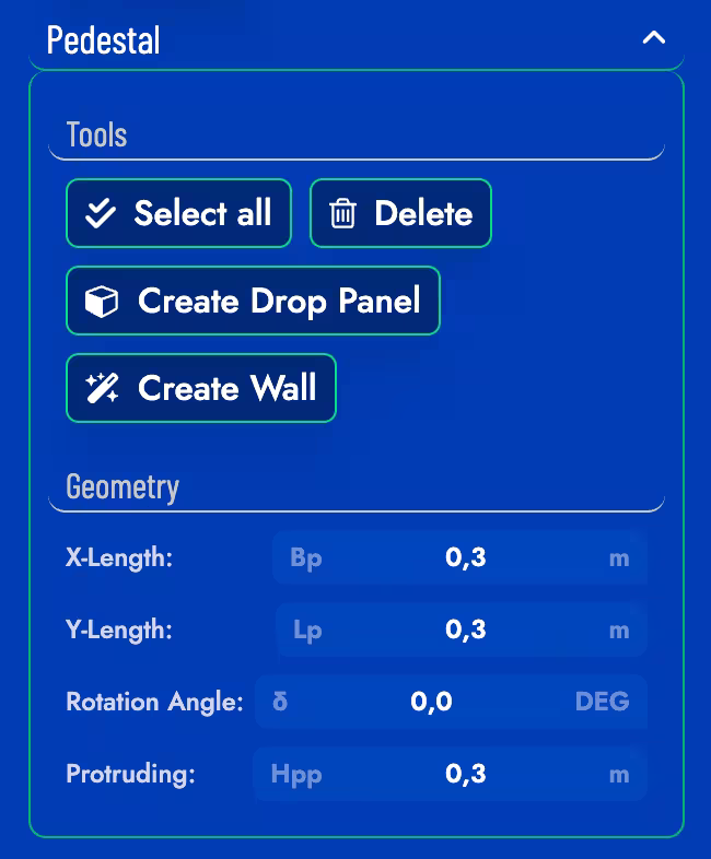 If the selected pedestals are part of a Mat foundation, there is also the option to Create Drop Panel and to Create a Wall if multiple pedestals of the same foundation are selected.