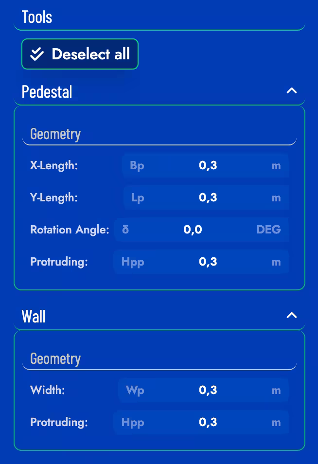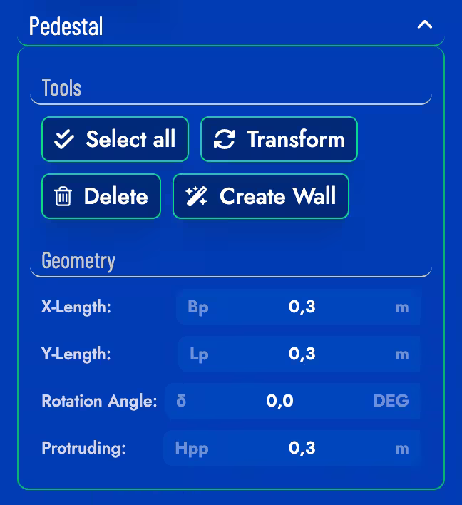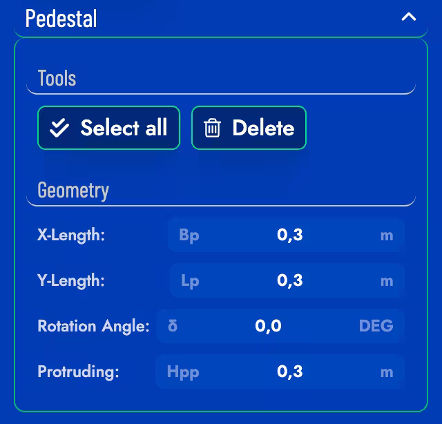 When selecting pedestals, you can change their dimensions (width, length and angle) and their protrusion height (Hpp). There is also the option to Select All to edit all pedestals at once and to Delete the selected pedestal.