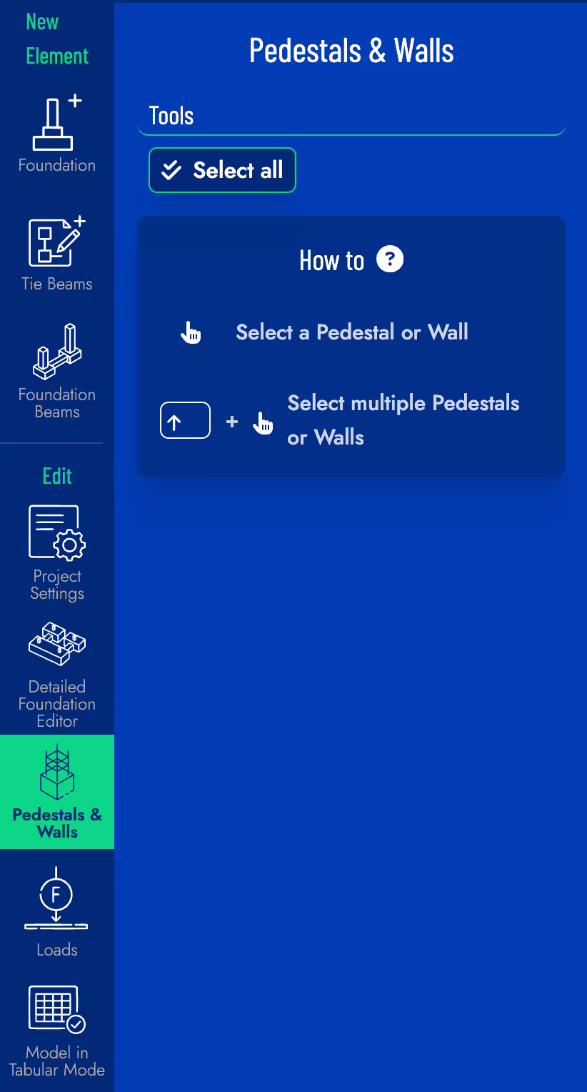 If the selected pedestals are part of a Strip foundation, there is also the option to Transform the pedestals into unloaded points and to Create a Wall if multiple pedestals of the same foundation are selected.
